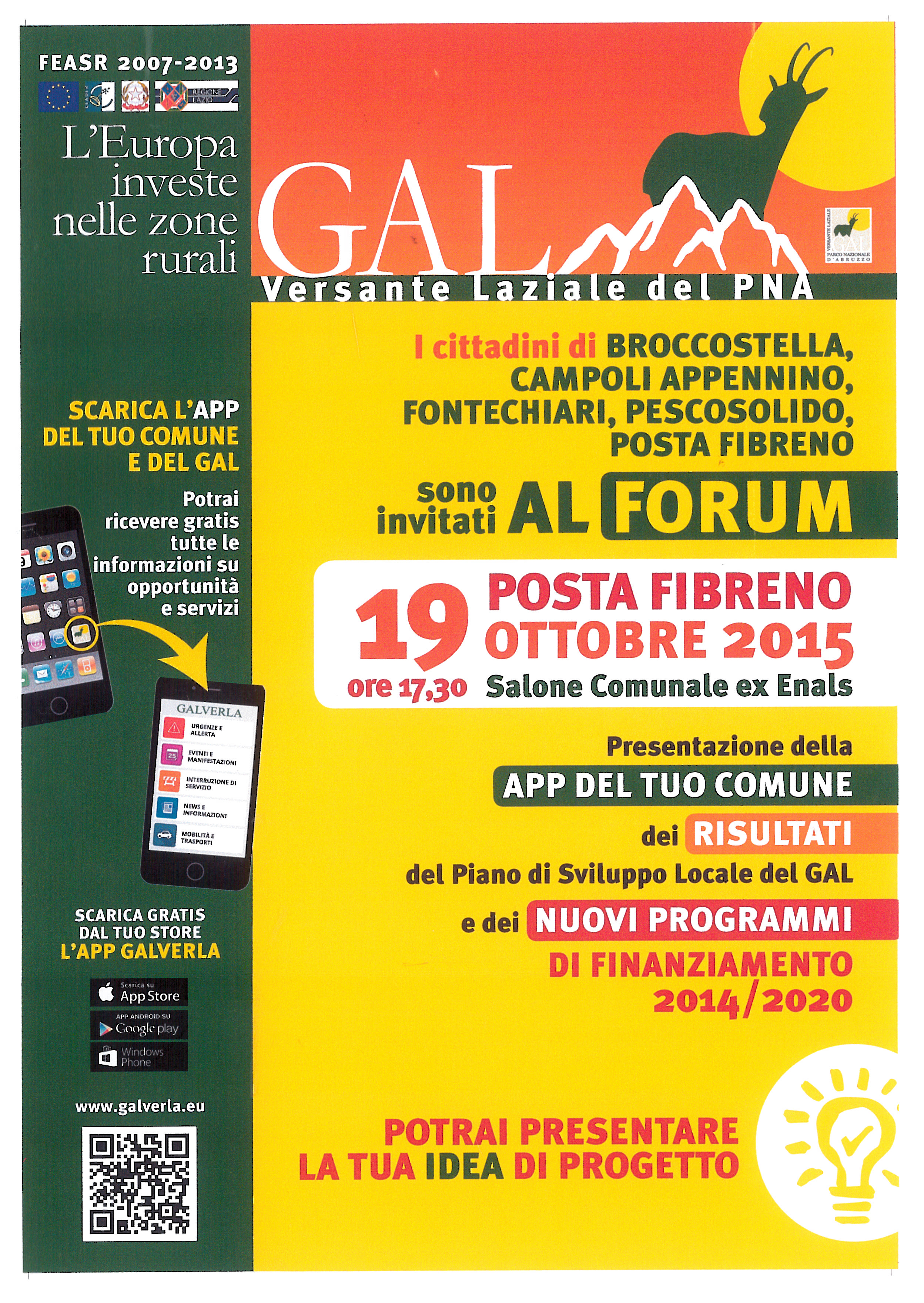 L’Amministrazione informa la cittadinanza che il 19 ottobre 2015 alle ore 17,30 a Posta Fibreno, presso il Salone Comunale avrà luogo il FORUM organizzato dal GAL Versante Laziale del PNA.